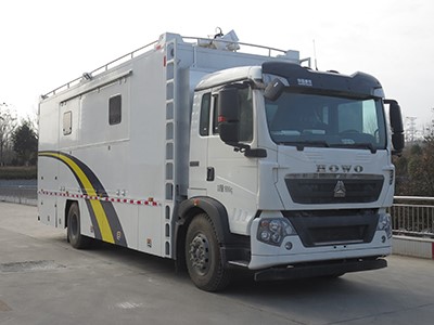 該車選用**重汽汕德卡牌二類底盤為平臺改裝而成。在駕駛室頂部 安裝有導流罩,廂體設計有鋁合金登頂梯,方便人員登頂檢修、瞭望,車 頂四周裝配裝飾套件,使整車外觀輪廓和線條更加美觀圓潤、動感流暢。